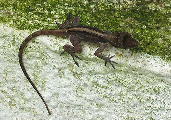 The most common reptile seen is the Anole, which can be found in our yard pretty much any time. The most common reptile or amphibian heard is the coqui, a small frog that calls every night, or after rain, or during rain, or at other random times. The nearby skinks grow so large that I almost think they could be monitor lizards.