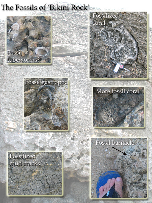 With all this sedimentary rock around, there are bound to be fossils and sure enough if you climb around 'Bikini Rock' you'll see a variety of fossilized creatures, most especially coral. The sandstone outcropping also has some fossil coral and shells. In between the beach is all sand, but offshore there are more rocks, likely the same as the rock outcropping to the west. Much of the sand of Sandy Beach is probably eroded sandstone.