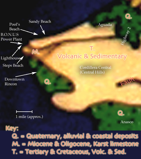 The Geology of the Rincón Area. We are near the boundary between the small Karst limestone outcropping and the Volcanic/Sedimentary Central Hills |