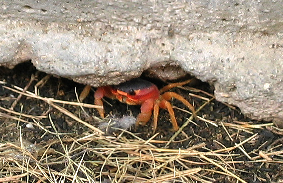 Our backyard is grass with patches of sand. Red shore crabs live around the edges of the property, which is bordered by a chain-link fence set in a rim of concrete. Along the back are several coconut palms, some quite mature.